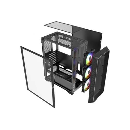 Recomandat GamingDaTip carcasaMiddleTowerSursa alimentareFara sursaPozitionare sursaJosGeam lateralDa, tempered glassInaltime cooler CPU155 mm (Max)Lungime video GPU320 mm (Max)Suport radiatorFata - 1 x 120/140/240/280/360mmIluminare LEDARGBDimensiuni456 x 390 x 200 mmGreutate5.05 kgCuloareNegru -