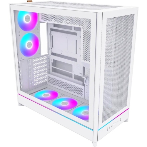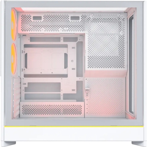 carcasa middle tower, culoare neagra, compartimentare inovatoare, layout reversibil, bracket de 7 sloturi expansiune ce permite montaj pe verticala sau orizontala a placii video, panou frontal din metal perforat, lateral din sticla, panou spate din otel partial perforat pentru evacuare ventilatoarele de pe lateral; compatibil cu: ATX / M-ATX / Mini-ITX si cu placi de baza ce folosesc tehnologia back-connect; GPU max 420mm, CPU max 175mm, PSU max 200mm; ventilatoare pre-instalate: 5x ventilatoare negre de 120mm PWM ARGB (3x in partea de jos si 2x in partea din spate), total ventilatoare: podea 3x 120mm, fata 3x 120/ 2x 140mm (cu posibilitate de reglare a pozitiei bracketului), sus 3x120 mm, spate 2x 120 mm; suport radiator: fata, 120/240 mm, sus 120/240/360 mm, spate 1x 120mm; front panel I/O: 1x Type-C/2x USB3.0/1x Mic/1x Audio/Buton iluminare/Power; maxim 4xSSD sau maxim 2xHDD; filtru de praf in podea, dimensiuni: carcasa 480 x 240 x 480 mm, cutie 563 x 323 x 573 mm; suport VGA pentru montajul placii video pe orizontala inclus.