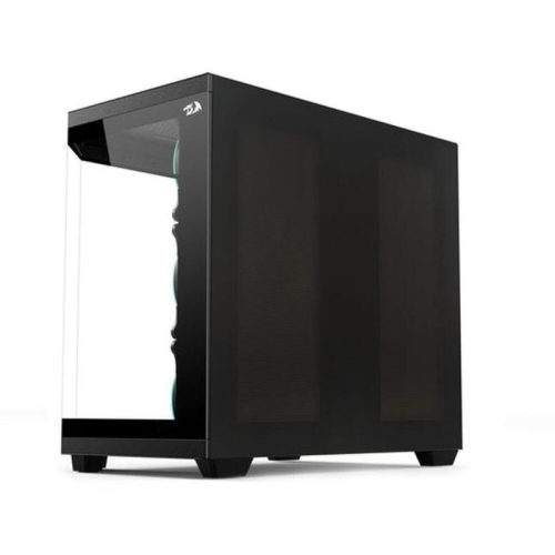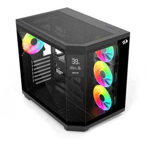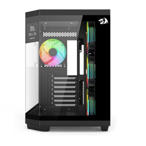 Carcasa Redragon Vision neagra, SPCC Steel (0.8mm) ATX Mid Tower, design dual chamber, fara sursa (tip ATX, montata sus), interior vopsit negru, 2x3.5” (intern), 2x2.5” (intern), design tool-less, Mainboard – 3x 120mm aRGB LED fans (inclus) / 2x 140mm fans (optional), spate – 1x 120mm aRGB LED fans (inclus), tavan – 3x 120mm fans (optional), podea – 3x 120mm fans (optional), 1x USB 3.0, 1x USB 2.0, 1x USB Type-C, HD Audio, ATX / microATX / ITX, design premium tip panorama cu panou lateral si frontal din sticla securizata, include display pentru afisarea diferitelor informatii, sloturi expansiune: x7, inaltime maxima cooler procesor: 163mm, lungime maxima placa video: 410mm (260mm daca este montat sistem de racire pe lichi in parta frontala), supoert radiatoare water cooling: Mainboard – 1x 240/280mm, tavan – 1x 360mm, podea – 1x 240mm, spate – 1x 120mm, dimensiuni (HxWxD): 400x350x426mm, greutate: 7.1kg