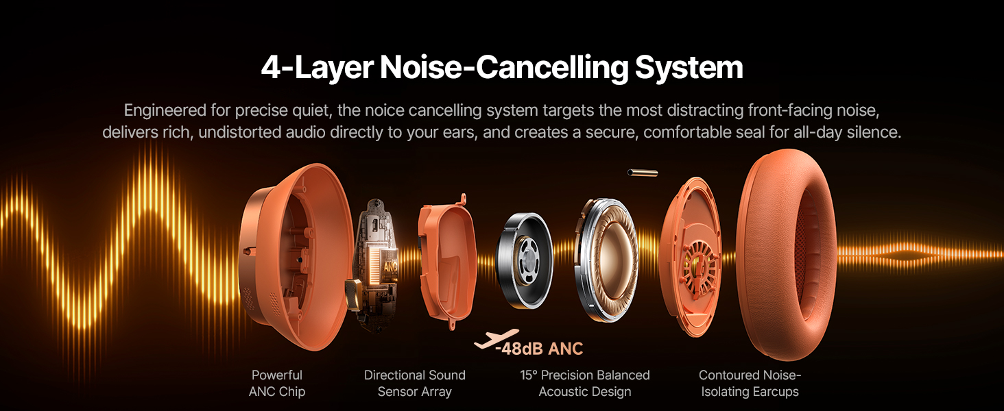 Blocati distragerile cu precizie. Sistemul ANC hibrid avansat cu 4 straturi analizeaza imprejurimile de 38.400 de ori pe secunda pentru a reduce zgomotul cu pana la -48 dB, de la motoarele de avion la bebelusii care plang. Casti ideale cu anulare a zgomotului pentru zboruri, navete sau sesiuni de concentrare profunda.