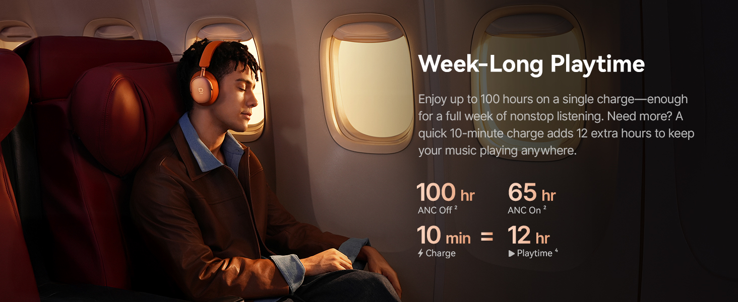 Bucurati-va de pana la 100 de ore de redare non-stop (ANC dezactivat) sau 65 de ore (ANC activat). O incarcare rapida de 10 minute ofera inca 12 ore. Aceste casti wireless cu autonomie mare a bateriei sunt concepute pentru ascultare pe o saptamana - ideale pentru calatoriile cu avionul sau utilizarea zilnica.