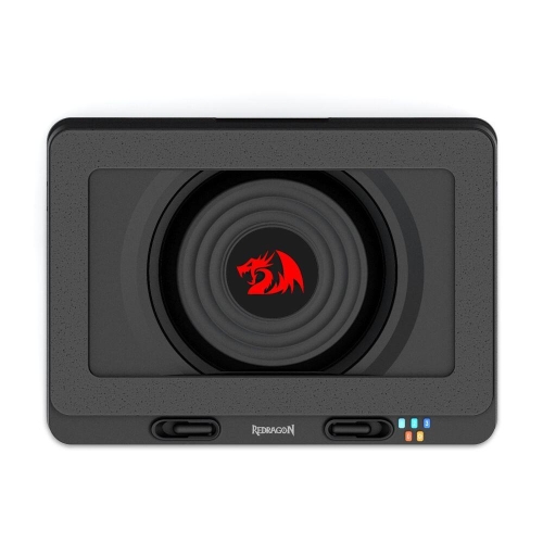 Cooler laptop Redragon Windseeker negru iluminare RGB, structura din plastic, dimensiune notebook: 15”-17”, 1 ventilator turbo de 150mm (1800-2400 RPM, trei trepte de viteza, 200CFM, 52-58dB), alimentare prin portul USB Type-C (port-ul Type-C al laptopului trebuie sa suporte PD Power Delivery), 4 unghiuri de inclinare, design anti-alunecare, burete de etansare al laptop-ului pentru a crea o presiune mai mare a aerului, iluminare RGB, include suport pentru telefon, dimensiuni: 390x280x58mm, greutate: 1.38kg