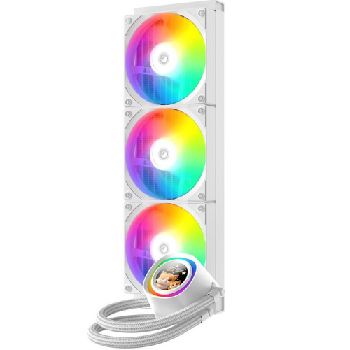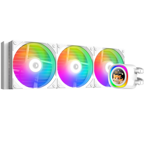 Cooler procesor cu lichid ID-Cooling FX360 LCD alb cu display iluminare aRGB, sistem pre-umplut cu lichid, putere de racire de pana la 350W TDP, 3x 120mm Hydraulic Bearing aRGB fan (300~2000±10%RPM, 58 CFM, 27.2 dBA, 1.94 mmH2O, PWM), pompa silentioasa aRGB (Ceramic Bearing, 2900 RPM, 25dBA) cu display (240x240px, 300cd/m², 262K culori, suporta GIF si MP4), , dimensiuni waterblock: 73x69x57mm, dimensiuni radiator: 396x120x27mm, lungime tub: 420mm, compatibil Intel LGA1851/1700/1200/115X / AMD AM4/AM5, compatibil cu Asus Aura Sync / Gigabyte RGB Fusion / ASRock Polychrome Sync / MSI Mystic Light