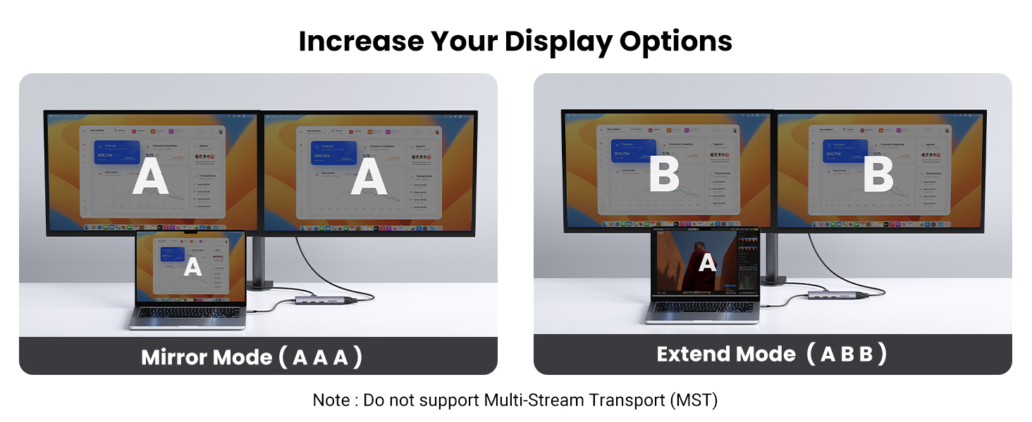 Porturile HDMI 4K si VGA 1080P pot fi utilizate simultan pentru diferite dispozitive de afisare, cum ar fi monitor, televizor, proiector. Rezolutia maxima de iesire atinge 4K 30Hz prin HDMI si 1080P 60Hz prin VGA. Modul oglinda AAA si modul extins ABB sunt acceptate atat pe Mac, cat si pe Windows.