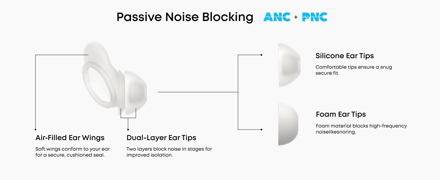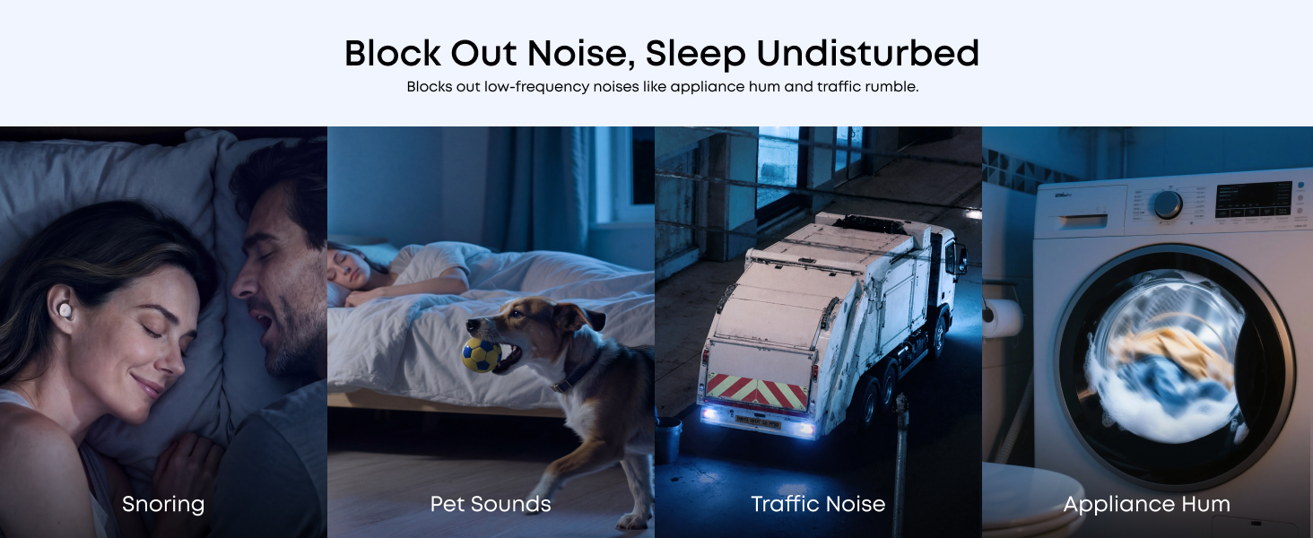 ANC inteligent cu tehnologie de adaptare a canalului auditiv se ajusteaza dinamic la urechile dvs., oferind o reducere mai profunda a zgomotului pentru o noapte linistita. Blocati eficient sforaitul, sunetele animalelor de companie, zumzetul aparatelor si zgomotul traficului exterior.