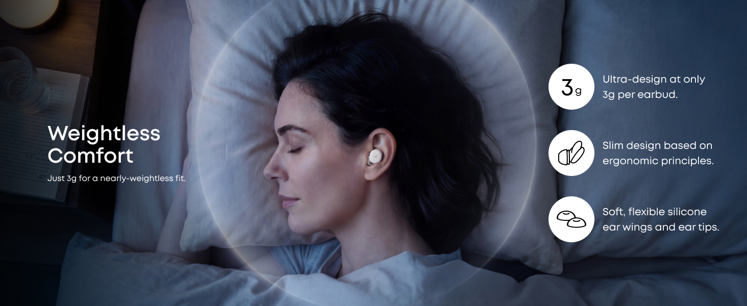 Dispune de silicon ultra-moale, duze scurte si un profil usor si subtire pentru a ameliora presiunea in cazul dormitului pe o parte. Folosind cartografierea 3D a mii de canale auditive, are o forma ergonomica pentru a se potrivi confortabil majoritatii urechilor.