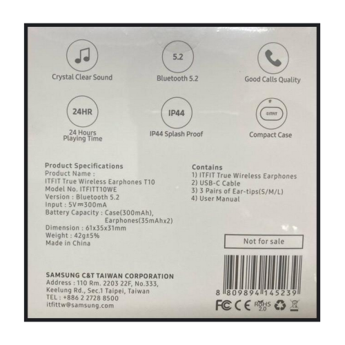 Samsung ITFIT True Wireless In-Ear Buds T10 White (BT5.2, IP44, 24Hrs autonomy, USB-C cable, S/M/L eartips)