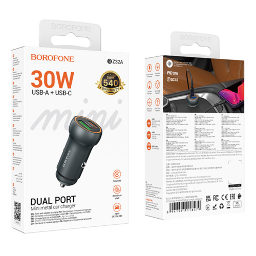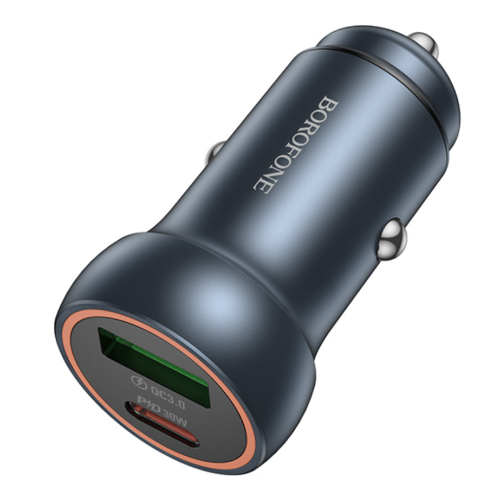 Incarcator auto Borofone BZ32A, 1 x USB-A, 1 x USB-C, 30 W, Gray