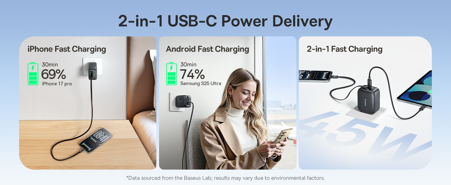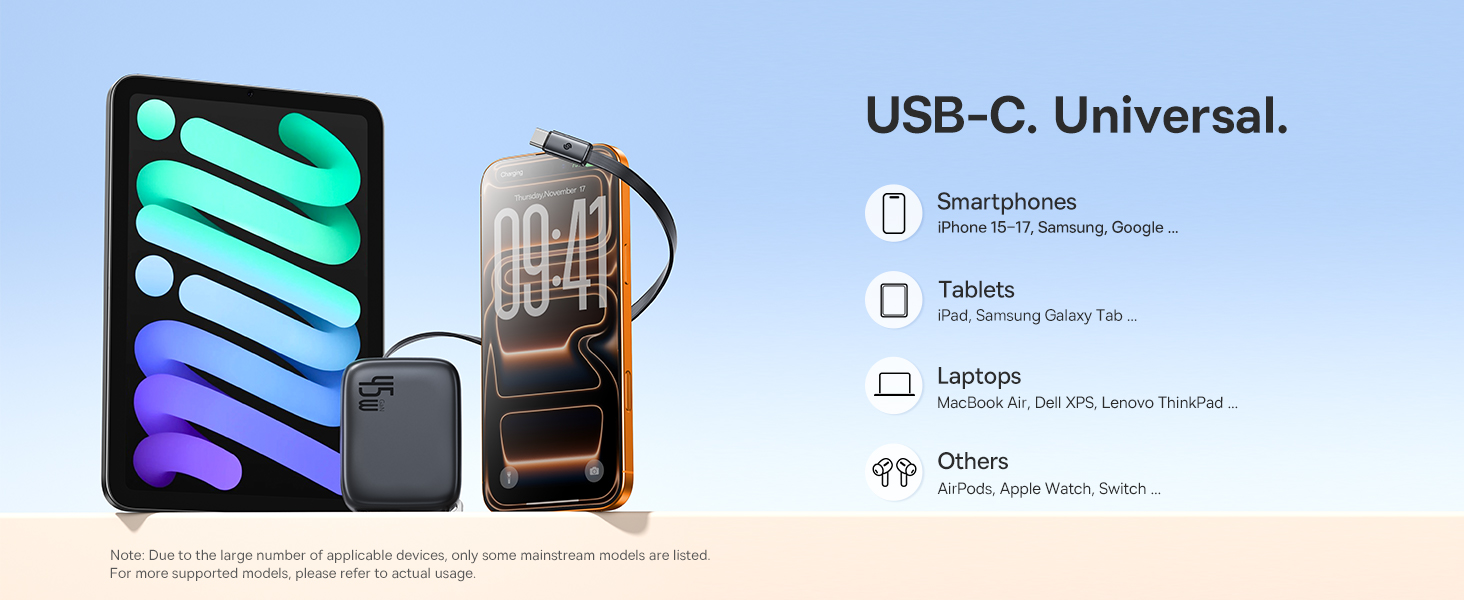 Accepta incarcare rapida la viteza maxima pentru seria iPhone 15-17 si seria Galaxy. Iesirea universala USB-C este compatibila cu telefoanele mobile obisnuite, iPad-uri, Switch, iPad si alte dispozitive. Accepta protocoalele PD 3.0, QC 3.0, AFC, FCP, PPS si alte protocoale pentru a asigura o incarcare rapida fiabila pentru mai multe dispozitive.