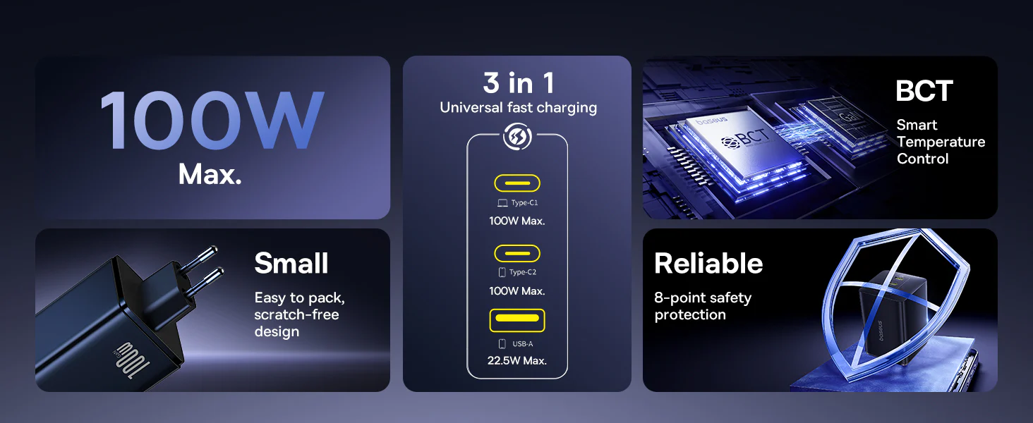 - Design trei intr-unul: porturile USB-C1, USB-C2 si USB-A incarca mai multe dispozitive simultan;