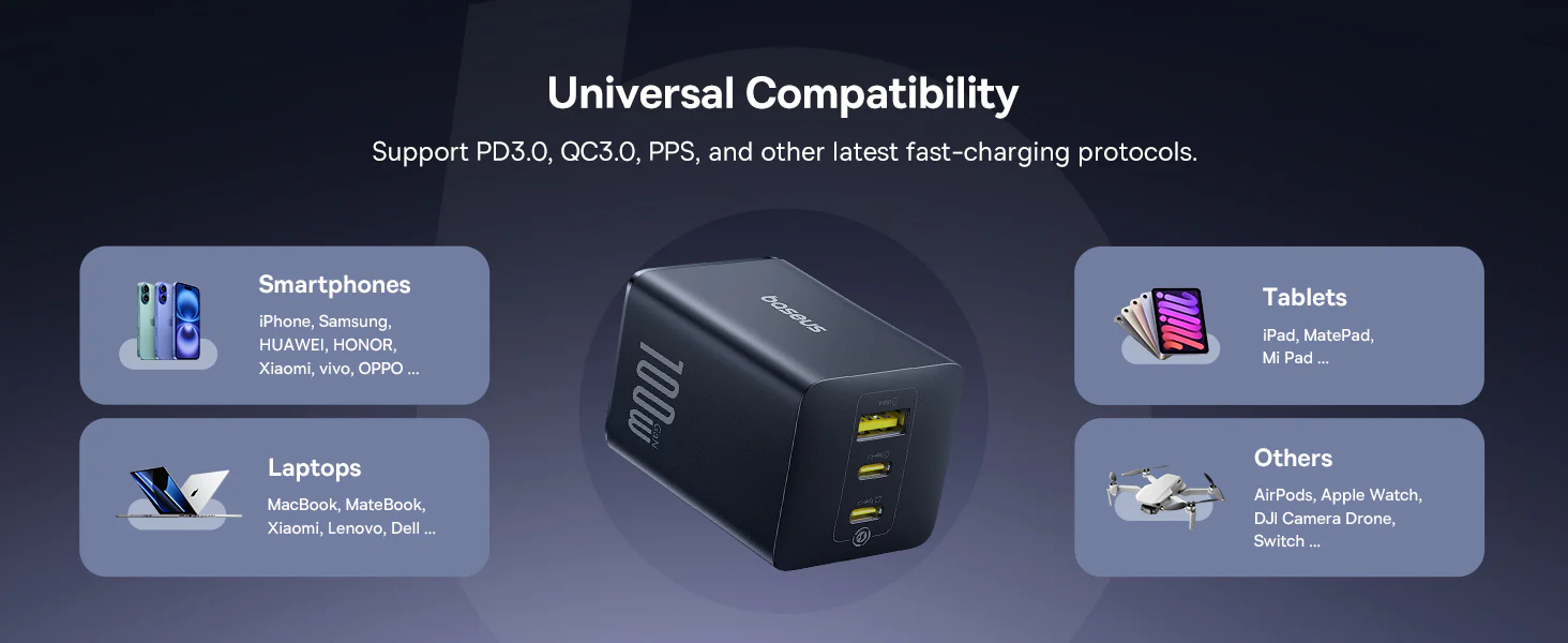 - Distributie inteligenta a energiei: 70 W + 30 W pe porturi USB-C duale sau 65 W + 20 W + 15 W pe toate cele trei porturi;