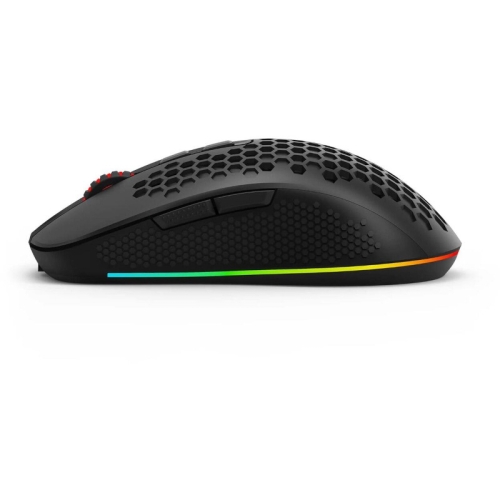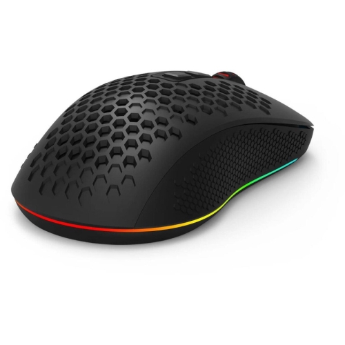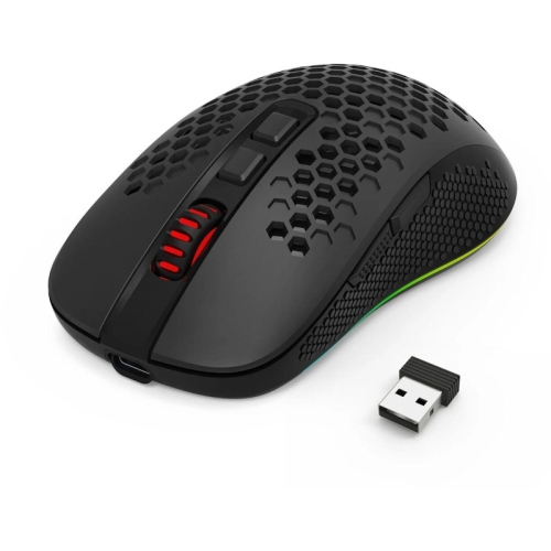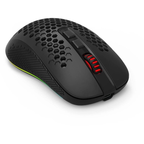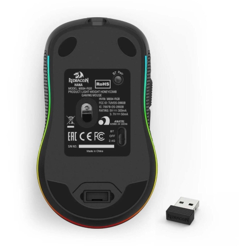 Mouse gaming wireless si bluetooth Redragon Hana RGB negru iluminare RGB, 7200 DPI (500 / 1000 / 2000 / 3000 / 8000 DPI), senzor optic, iluminare LED RGB (16.8 milioane de culori) cu diverse efecte de iluminare, numar butoane: 7 (programabile), micro switch-uri Huano (durata de viata: 10 milioane click-uri), acumulator: 400mAh, autonomie: aproximativ 80 ore, design ergonomic, lungime cablu: 1.8m, picioare de teflon, receiver USB, dimensiuni: 122x70x39mm, greutate: 91g