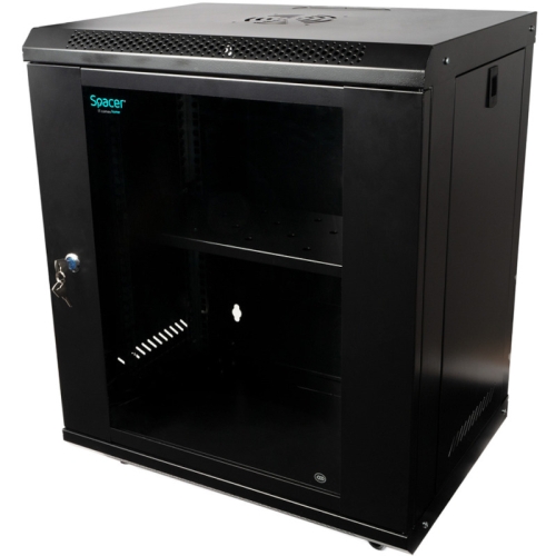 CABINET 19" SPACER 12U 500x400mm, fixare pe perete, Flatpack (dezasamblat), Grey, usa sticla cu blocare, panouri detasabile, otel 1mm, sarcina maxima 25Kg, contine un raft si roti, "SPCW-12U-400-GR-02" SPCW-12U-400-GR-02
