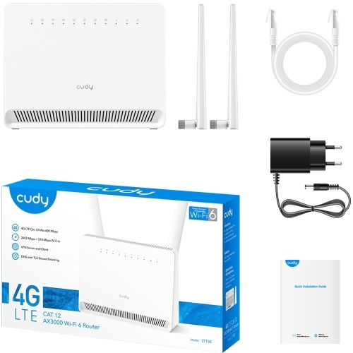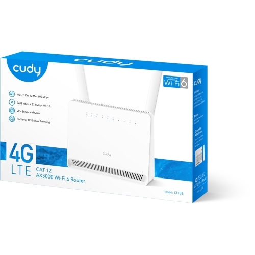 Cudy LT15E este un router 4G LTE Cat.12 cu Wi-Fi 6 AX3000, ideal pentru locuințe, birouri sau zone fără internet fix. Oferă viteze de până la 600 Mbps prin 4G și 2402 Mbps pe Wi-Fi 5 GHz, având procesor dual-core 1.3 GHz, 256 MB RAM și 128 MB flash. Dispune de 4 porturi Gigabit, slot Nano-SIM și suport eSIM, precum și 4 antene interne + 2 externe detașabile pentru semnal stabil.