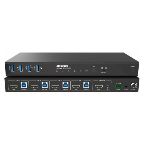 Acesta este un comutator KVM 4x1 cu comutare prin taste rapide. Acesta suportă rezoluții de până la 4K@60Hz 4:4:4 8bit și poate transmite, de asemenea, semnal USB 3.0 până la 5Gbps pentru funcția KVM.
