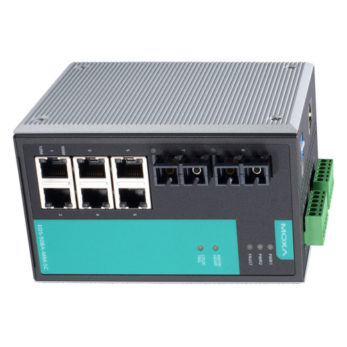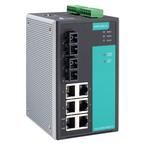 Switch-urile Ethernet cu management cu 8 porturi EDS-508A, cu tehnologiile avansate Turbo Ring și Turbo Chain (timp de recuperare < 20 ms), RSTP/STP și MSTP, sporesc fiabilitatea și disponibilitatea rețelei Ethernet industriale. De asemenea, sunt disponibile modele cu o gamă largă de temperaturi de operare de la -40 la 75°C, iar switch-urile suportă funcții avansate de management și securitate, ceea ce face ca switch-urile EDS-508A să fie potrivite pentru orice mediu industrial dur.