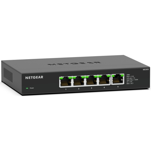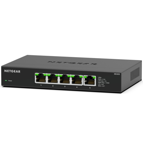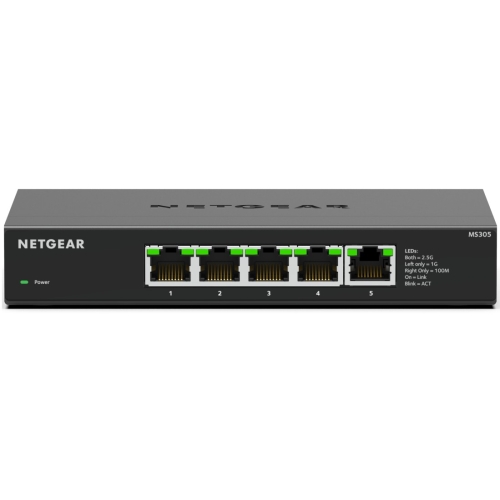 The NETGEAR 5-port 2.5G Multi-Gigabit Unmanaged Essentials Switch, MS305, offers businesses an affordable solution to upgrade their networks to multi-gig speeds. Featuring five (5) 2.5G ports encased in durable metal, the MS305 Multi-Gigabit Ethernet Essentials Switch is designed for versatility—it can be placed on a desk, mounted on a wall, or under a table using the included kit.