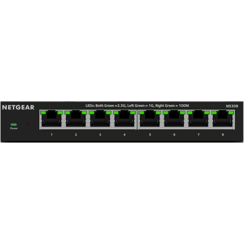The NETGEAR 8-port 2.5G Multi-Gigabit Unmanaged Essentials Switch, MS308, offers businesses an affordable solution to upgrade their networks to multi-gig speeds. Featuring eight (8) 2.5G ports encased in durable metal, the MS308 Multi-Gigabit Ethernet Essentials Switch is designed for versatility—it can be placed on a desk, mounted on a wall, or under a table using the included kit.