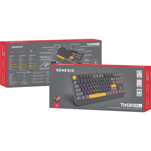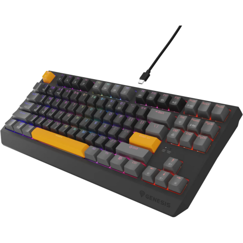 Tastatura gaming mecanica cu fir Genesis Thor 230 TKL, iluminare RGB, switch Linear, switch model Outemu Red, numar taste 87, 11 butoane multimedia, lungime cablu 1.6m, dimensiuni 363 x 155 x 39 mm, gri