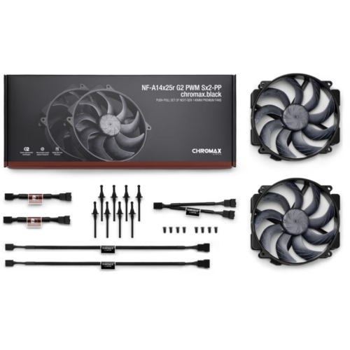 set 2 ventilatoare 140x140x25mm, 2 ventilatoare (PPA si PPB) in sistem Push-pull cu decalaj de viteza de 25rpm pentru evitarea vibratiilor nedorite, conectare 4 pini PWM, viteza maxima de rotatie 1500 / 1250 (cu LNA) RPM, volum aer 155.6 / 127.1 (cu LNA) m³/h, nivel zgomot 24.8 / 19.7 (cu LNA) dBA, presiune statica 2.56 / 1.3 (cu LNA) mm H2O, AAO Frame (Advanced Acoustic Optimisation), lagar de tip SSO2, elice cu geometrie inovatoare de tip Progressive-Bend, motor de noua generatie etaPERF™ si controller de viteza NE-FD6, pachetul include: NF-A14x25r G2 PWM PPA , NF-A14x25r G2 PWM PPB, 2x adaptor L.N.A. pentru reducerea turatiei, 8 suruburi din cauciuc antivibratie, cablu splitter Y pentru 4 pini PWM, 2x cablu de extensie 30cm, 8x suruburi metalice, culoare negru.