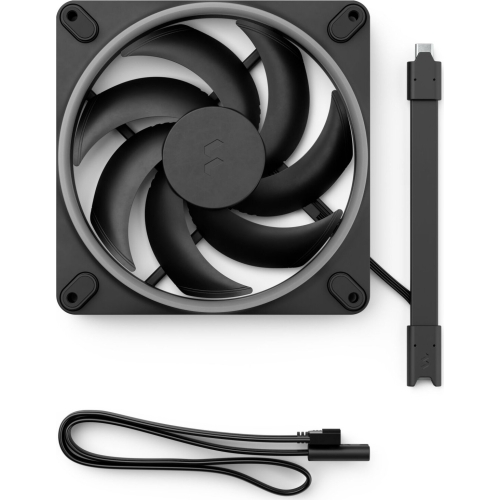 ventilator, 140x140x25mm, 350 (±150) - 1800 RPM (± 10%), 74,39 CFM, 28 dBA, presiune statica 2.45 mm H2O, rulment Fluid Dynamic, elice cu 7 pale, culoare NEAGRA a palelor si a cadrului, conector Fractal Connect (asemanator USB type C) ce permite o interconectare (daisy chain) usoara a ventilatoarelor si un prelungitor de 50 cm cu rol de splitter ce permite conectarea la conectorii clasici 4 pini PWM si 3 pini 5V ARGB.